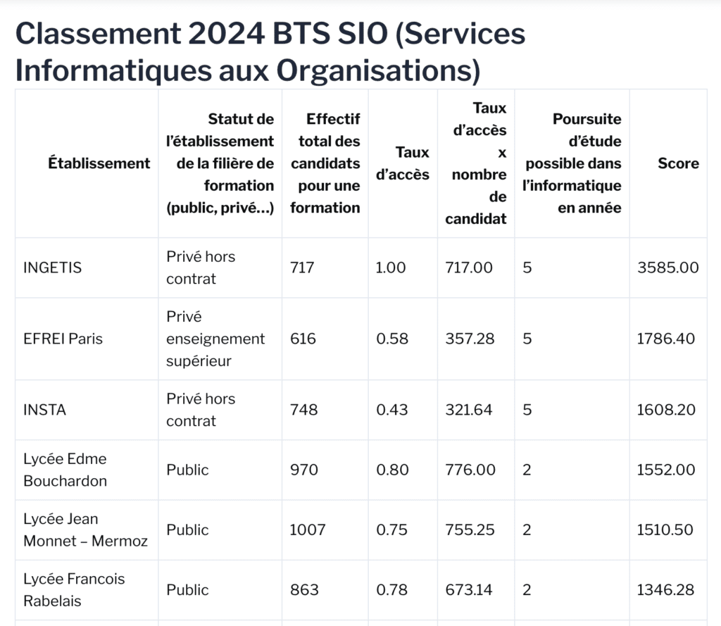 Classement BTS SIO (Services Informatiques aux Organisations) – INGETIS